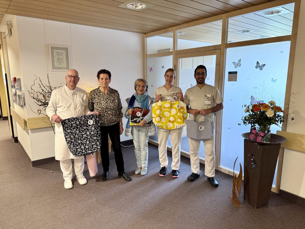 Bild: Chefarzt Dr. Spes, Vorstandsvorsitzender des Hospizvereins Altötting, Christa Sieber, Ideengeberin, Fr. Renate Ramgraber, Schneiderin, Stationsleitung Franziska Schickhuber und Chat Barakat, leitender Oberarzt